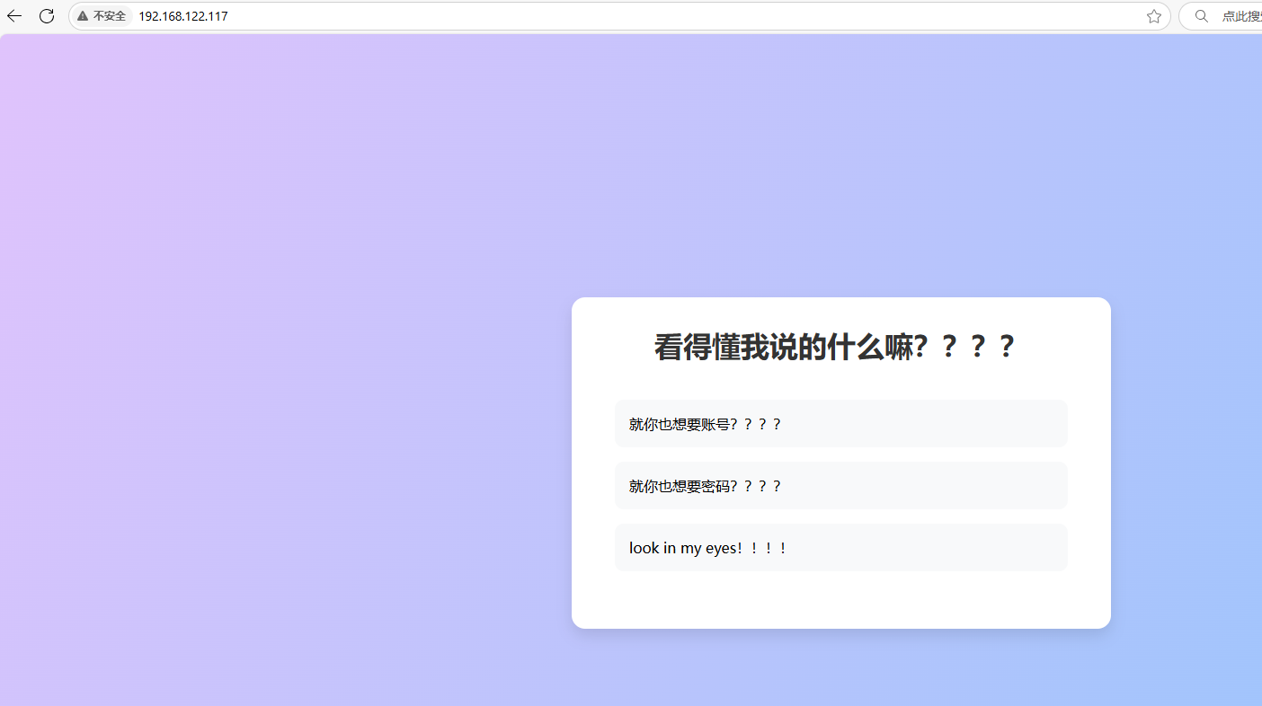一.信息收集: 1.1 端口扫描: 1 2 3 4 5 6 7 8 9 10 11 12 13 14 15 16 17 18 19 20 21 22 23 24 25 26 27 28 29 30 31 32 ┌──(root㉿kali)-[~] └─ Starting Nmap 7.95 ( https://nmap.org ) at 202 5-0 6-02 08 :55 EDT Nmap scan report for 192.168 .122.117 Host is up (0.00052 s latency). Not shown: 65532 closed tcp ports (reset) PORT STATE SERVICE VERSION22 /tcp open ssh OpenSSH 8.4 p1 Debian 5 + deb11u3 (protocol 2.0 ) | ssh-hostkey: | 3072 f6:a3:b6:78 :c4:62 :af:44 :bb:1 a:a0:0 c:08 :6 b:98 :f7 (RSA) | 256 bb:e8:a2:31 :d4:05 :a9:c9:31 :ff:62 :f6:32 :84 :21 :9 d (ECDSA) |_ 256 3 b:ae:34 :64 :4 f:a5:75 :b9:4 a:b9:81 :f9:89 :76 :99 :eb (ED25519)80 /tcp open http Apache httpd 2.4 .62 ((Debian)) |_http-title: \xE6\x88\x91\xE7\x9A\x84\xE9\xA1\xB5\xE9\x9D\xA2 |_http-server-header: Apache/2.4.62 (Debian)5001 /tcp open http Werkzeug httpd 3.1 .3 (Python 3.9 .2 ) |_http-server-header: Werkzeug/3.1.3 Python/3.9.2 |_http-title: 405 Method Not Allowed MAC Address: 08 :00 :27 :6 D:4 E:8 B (PCS Systemtechnik/Oracle VirtualBox virtual NIC) Device type: general purpose|routerRunning: Linux 4 .X|5 .X, MikroTik RouterOS 7 .X OS CPE: cpe:/ o:linux:linux_kernel:4 cpe:/ o:linux:linux_kernel:5 cpe:/ o:mikrotik:routeros:7 cpe:/ o:linux:linux_kernel:5.6 .3 OS details: Linux 4.15 - 5.19 , OpenWrt 21.02 (Linux 5.4 ), MikroTik RouterOS 7.2 - 7.5 (Linux 5.6 .3 ) Network Distance: 1 hop Service Info: OS: Linux; CPE: cpe:/ o:linux:linux_kernel TRACEROUTE HOP RTT ADDRESS1 0.52 ms 192.168 .122.117 OS and Service detection performed. Please report any incorrect results at https:// nmap.org/ submit/ . Nmap done: 1 IP address (1 host up) scanned in 32.34 seconds