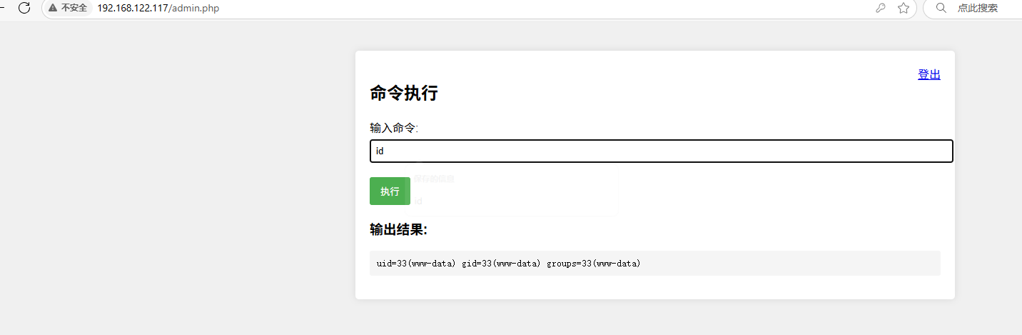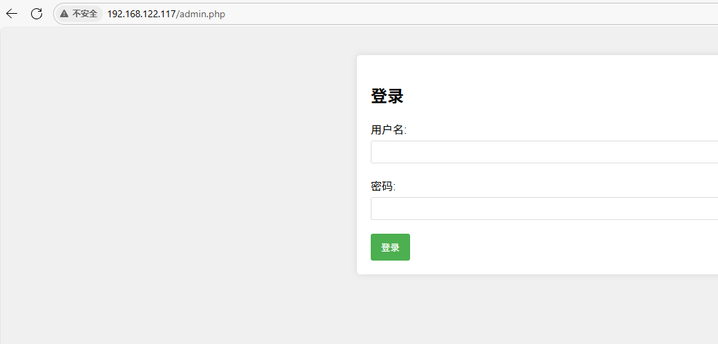 1.2 目录扫描: 1 2 3 4 5 6 7 8 9 10 11 12 13 14 15 16 17 18 19 20 21 22 23 24 25 26 27 28 29 30 31 32 33 34 35 36 37 38 39 40 41 42 43 44 45 46 47 48 49 50 51 52 53 54 55 56 57 ┌──(root㉿kali)-[~]└─# gobuster dir -w /usr/share/wordlists/dirb/common.txt -u http://192.168.122.117/ -x php txy zip =============================================================== Gobuster v3.6by OJ Reeves (@TheColonial) & Christian Mehlmauer (@firefart) =============================================================== [+] Url: http://192.168.122.117/ [+] Method: GET [+] Threads: 10 [+] Wordlist: /usr/share/wordlists/dirb/common.txt [+] Negative Status codes: 404 [+] User Agent: gobuster/3.6 [+] Extensions: php [+] Timeout: 10s =============================================================== Starting gobuster in directory enumeration mode =============================================================== /.php (Status: 403) [Size: 280] /.hta.php (Status: 403) [Size: 280] /.hta (Status: 403) [Size: 280] /.htaccess (Status: 403) [Size: 280] /.htpasswd.php (Status: 403) [Size: 280] /.htpasswd (Status: 403) [Size: 280] /.htaccess.php (Status: 403) [Size: 280] /admin.php (Status: 200) [Size: 1833] /admin.php (Status: 200) [Size: 1833] /index.html (Status: 200) [Size: 2131] /server-status (Status: 403) [Size: 280]Progress: 9228 / 9230 (99.98%) =============================================================== Finished =============================================================== ┌──(root㉿kali)-[~]└─# gobuster dir -w /usr/share/wordlists/dirb/common.txt -u http://192.168.122.117:5001/ -x php txy zip =============================================================== Gobuster v3.6by OJ Reeves (@TheColonial) & Christian Mehlmauer (@firefart) =============================================================== [+] Url: http://192.168.122.117:5001/ [+] Method: GET [+] Threads: 10 [+] Wordlist: /usr/share/wordlists/dirb/common.txt [+] Negative Status codes: 404 [+] User Agent: gobuster/3.6 [+] Extensions: php [+] Timeout: 10s =============================================================== Starting gobuster in directory enumeration mode =============================================================== /info (Status: 200) [Size: 12462]Progress: 9228 / 9230 (99.98%) =============================================================== Finished ===============================================================