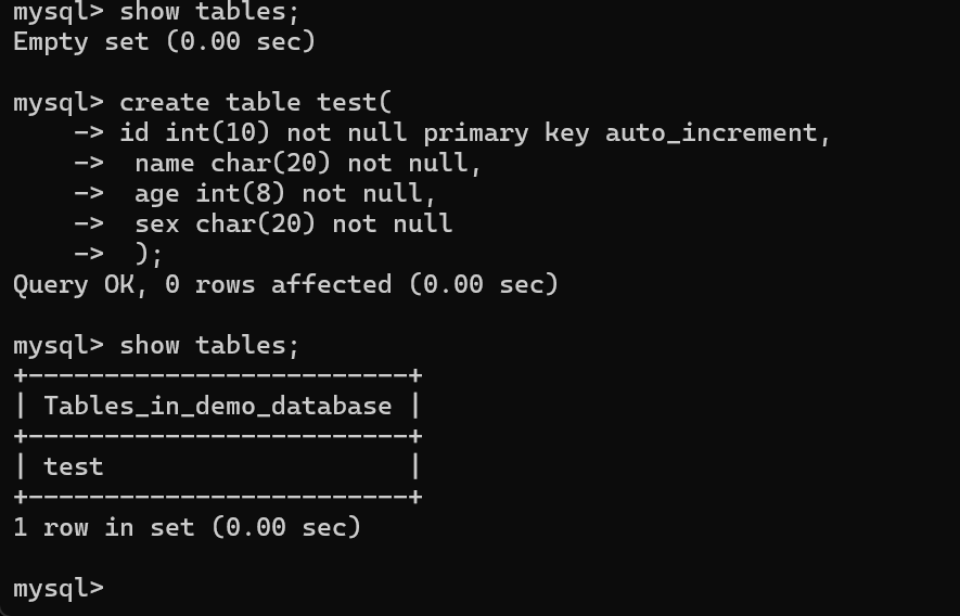 | show databases; //展示数据库 create database demo_database; //创建一个demo_database库 drop database demo_database; //删除一个demo_database库 use demo_database; //切换数据库 create table test( //创建一个test的表 id int(10) not null primary key auto_increment, //id唯一 且自增长 name char(20) not null, age int(8) not null, sex char(20) not null ); DROP TABLE test; //删除表
