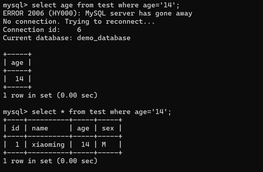 | SELECT *或其他 FROM 数据表(可以是多个) WHERE 需要满足的条件; select age from test where age='14'; select * from test where age='14';
