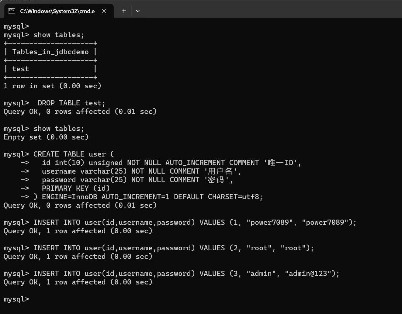 | CREATE DATABASE jdbcdemo; USE jdbcdemo; CREATE TABLE user ( id int(10) unsigned NOT NULL AUTO_INCREMENT COMMENT '唯一ID', username varchar(25) NOT NULL COMMENT '用户名', password varchar(25) NOT NULL COMMENT '密码', PRIMARY KEY (id) ) ENGINE=InnoDB AUTO_INCREMENT=1 DEFAULT CHARSET=utf8;