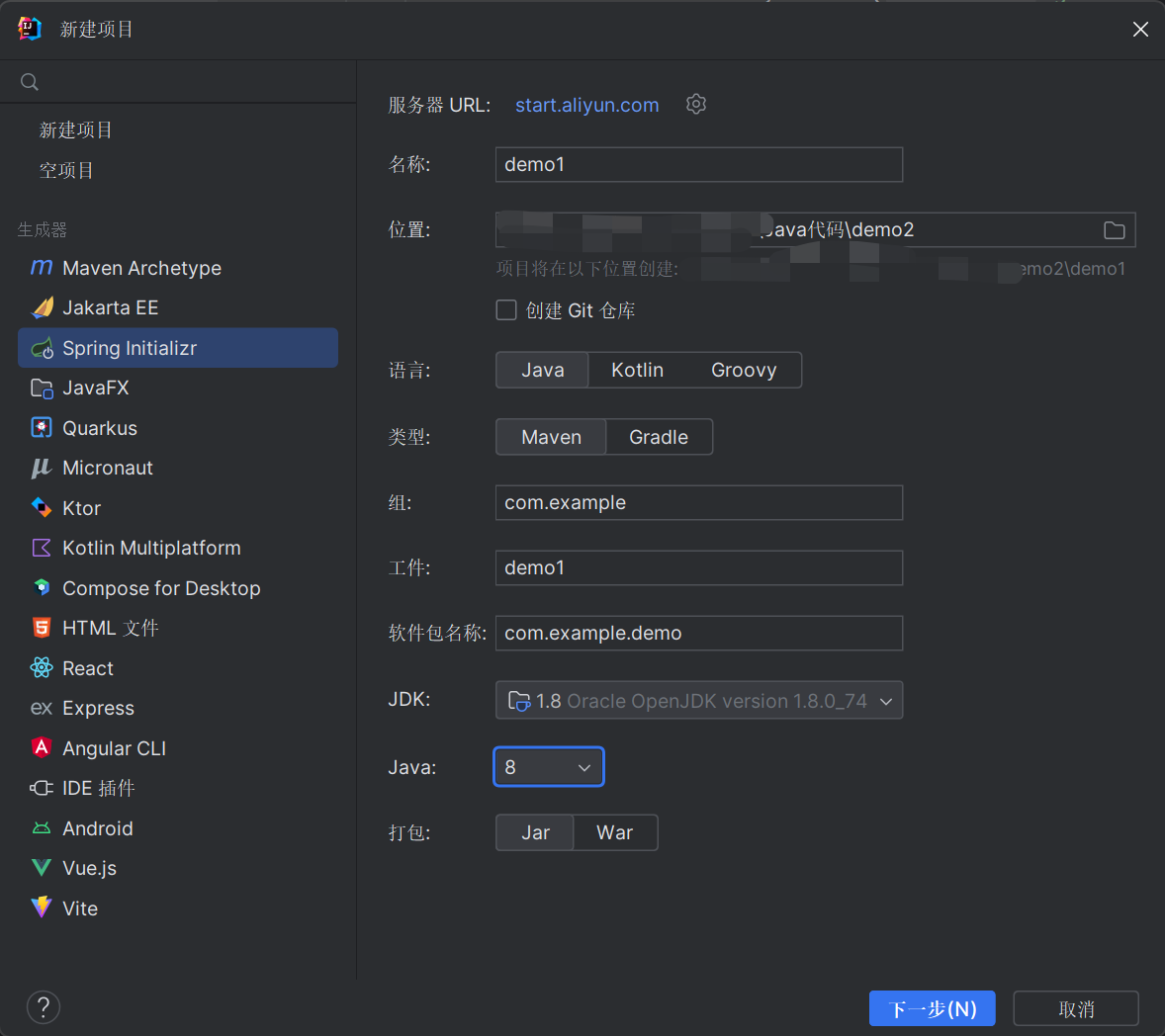 在 Spring Initializr Project Settings 页面,将 Java Version设置为8 ,其他配置项默认即可,点击Next。