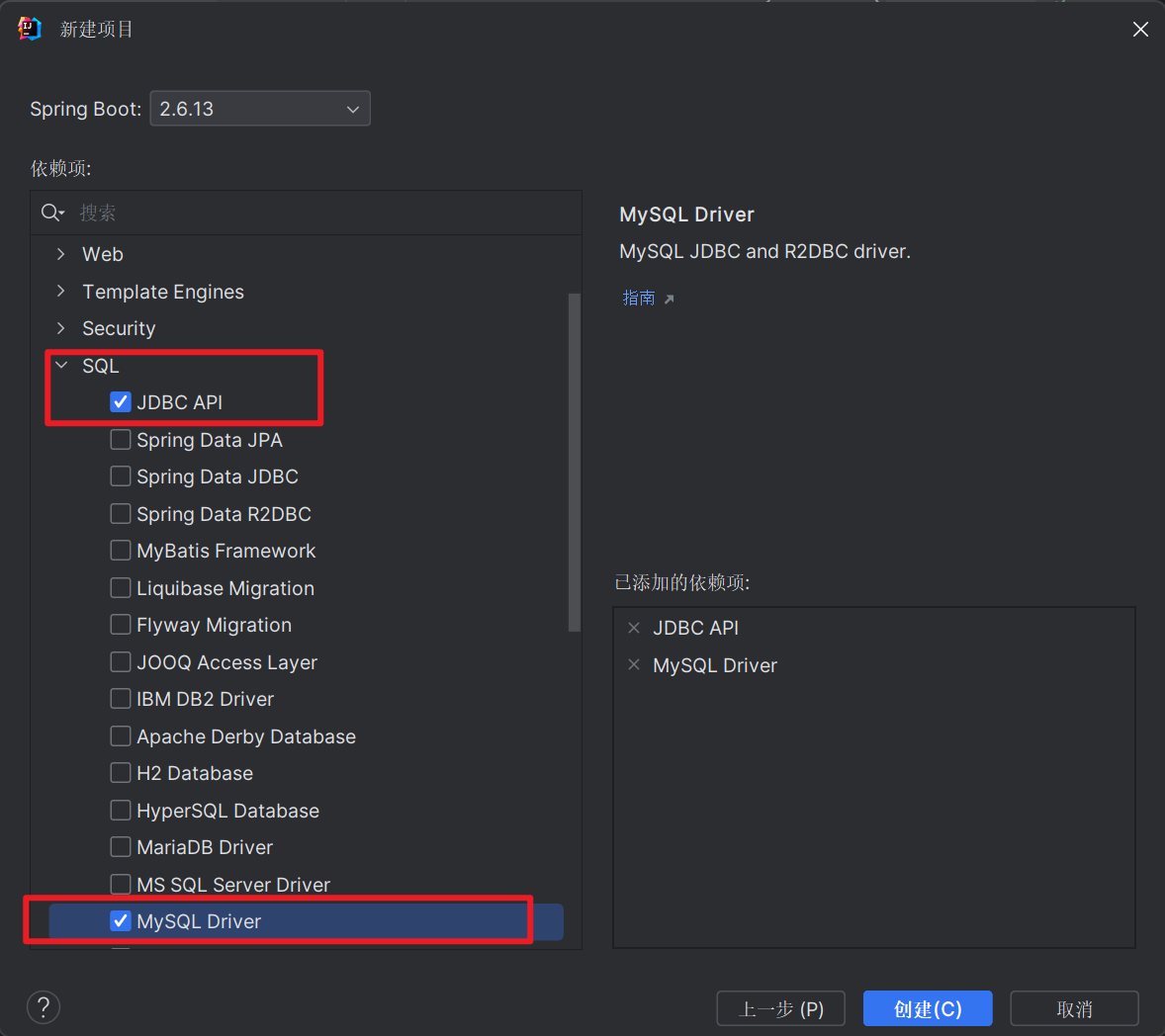在依赖选项界面,我们选择 web -> Spring Web , SQL -> JDBC API , SQL -> Mybatis Framework , SQL -> Mysql Driver ,注意,一共需要勾选四个依赖。如下图所示: