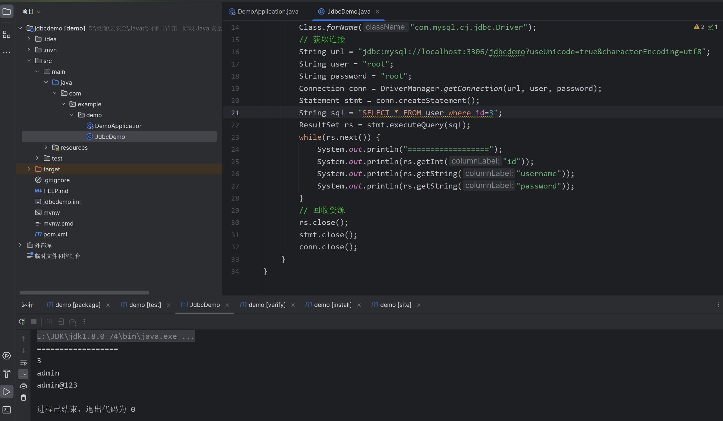 public class JdbcDemo { public static void main(String[] args) throws Exception { // 注册驱动 Class.forName("com.mysql.cj.jdbc.Driver"); // 获取连接 String url = "jdbc:mysql://localhost:3306/jdbcdemo?useUnicode=true&characterEncodin g=utf8"; String user = "root"; String password = "root"; Connection conn = DriverManager.getConnection(url, user, password); Statement stmt = conn.createStatement(); String sql = "SELECT * FROM user where id=2"; ResultSet rs = stmt.executeQuery(sql); while(rs.next()) { System.out.println("=================="); System.out.println(rs.getInt("id")); System.out.println(rs.getString("username")); System.out.println(rs.getString("password")); } // 回收资源 rs.close(); stmt.close(); conn.close(); } }