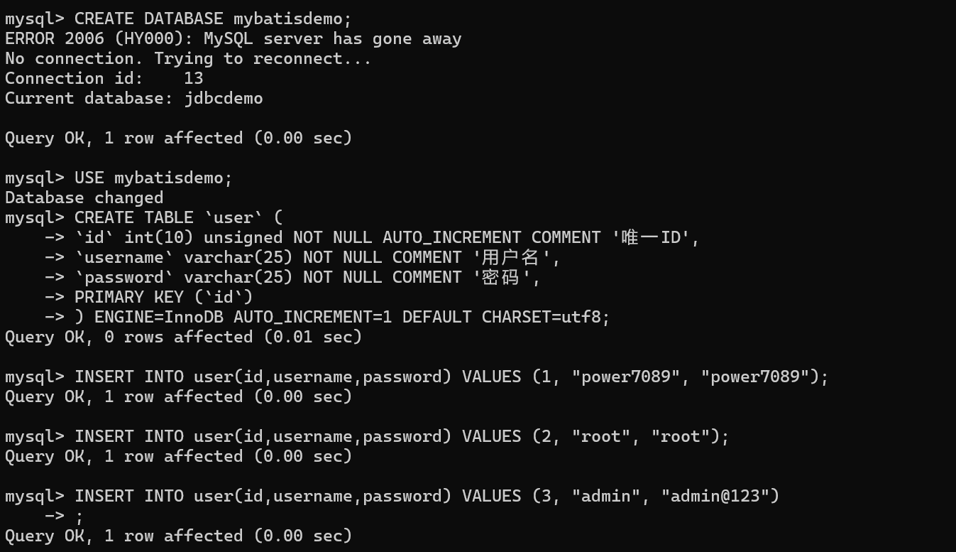 USE mybatisdemo; CREATE TABLE `user` ( `id` int(10) unsigned NOT NULL AUTO_INCREMENT COMMENT '唯一ID', `username` varchar(25) NOT NULL COMMENT '用户名', `password` varchar(25) NOT NULL COMMENT '密码', PRIMARY KEY (`id`) ) ENGINE=InnoDB AUTO_INCREMENT=1 DEFAULT CHARSET=utf8;