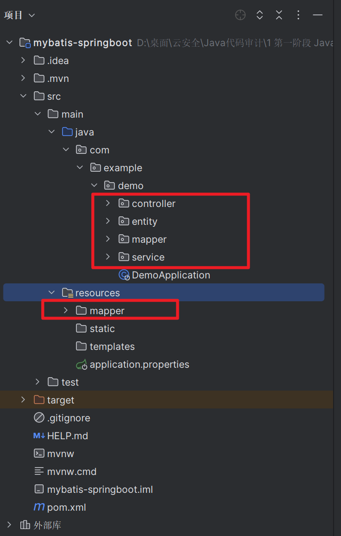 首先我们针对目录结构进行改动,根据不同作用类创建对应的代码包,在src.main.java.com.example.demo 下分别创建 controller , service , entity , mapper ,service->impl ,以及 src.main.resources 下创建 mapper ,最终目录结构如下图所示: