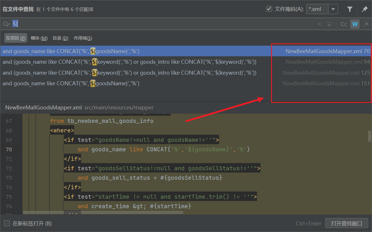 因此,我们在代码审计阶段进行SQL注入漏洞挖掘,应关注 xxxxMapper.xml 中使用 ${} 拼接SQL的地方,全局搜索关键字符。