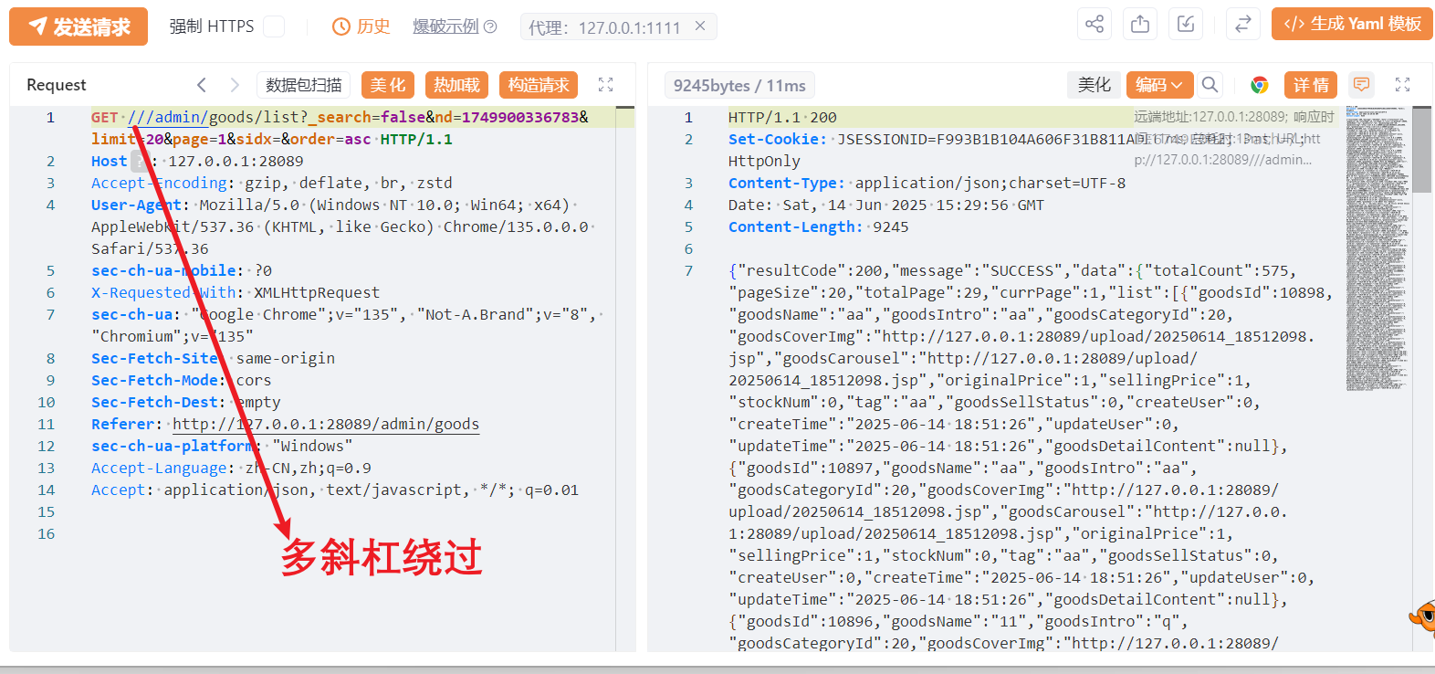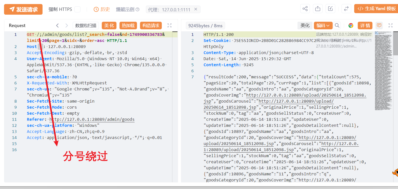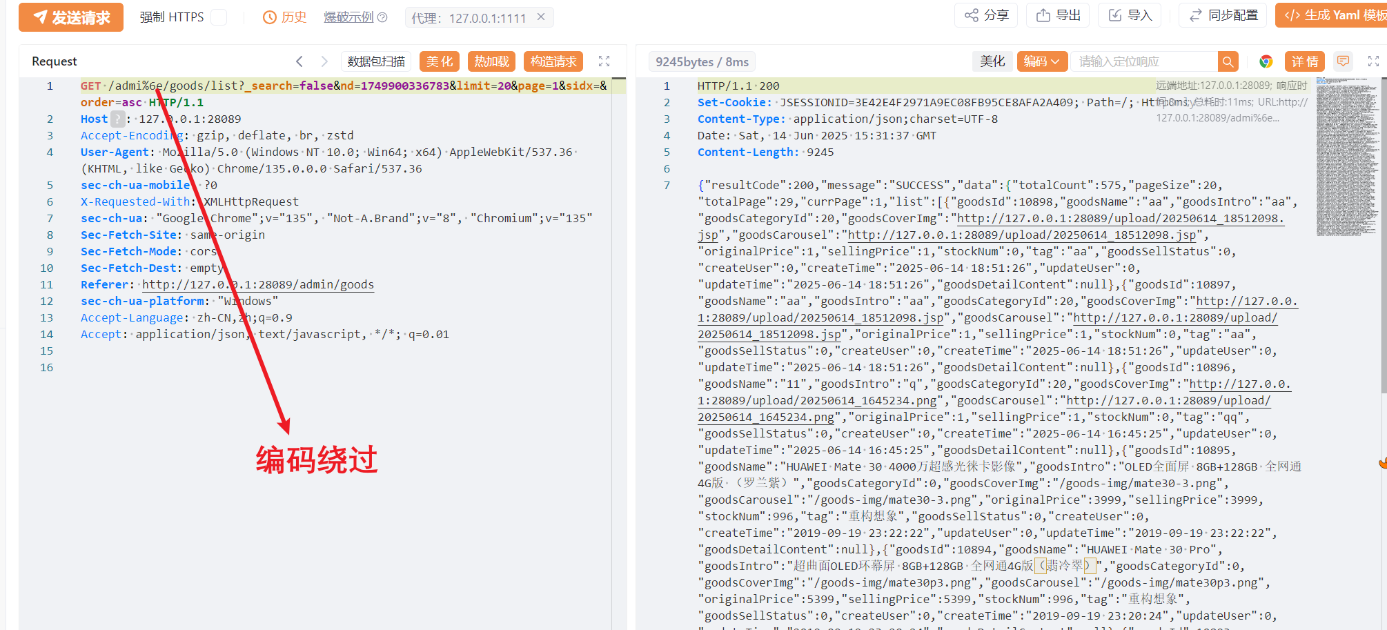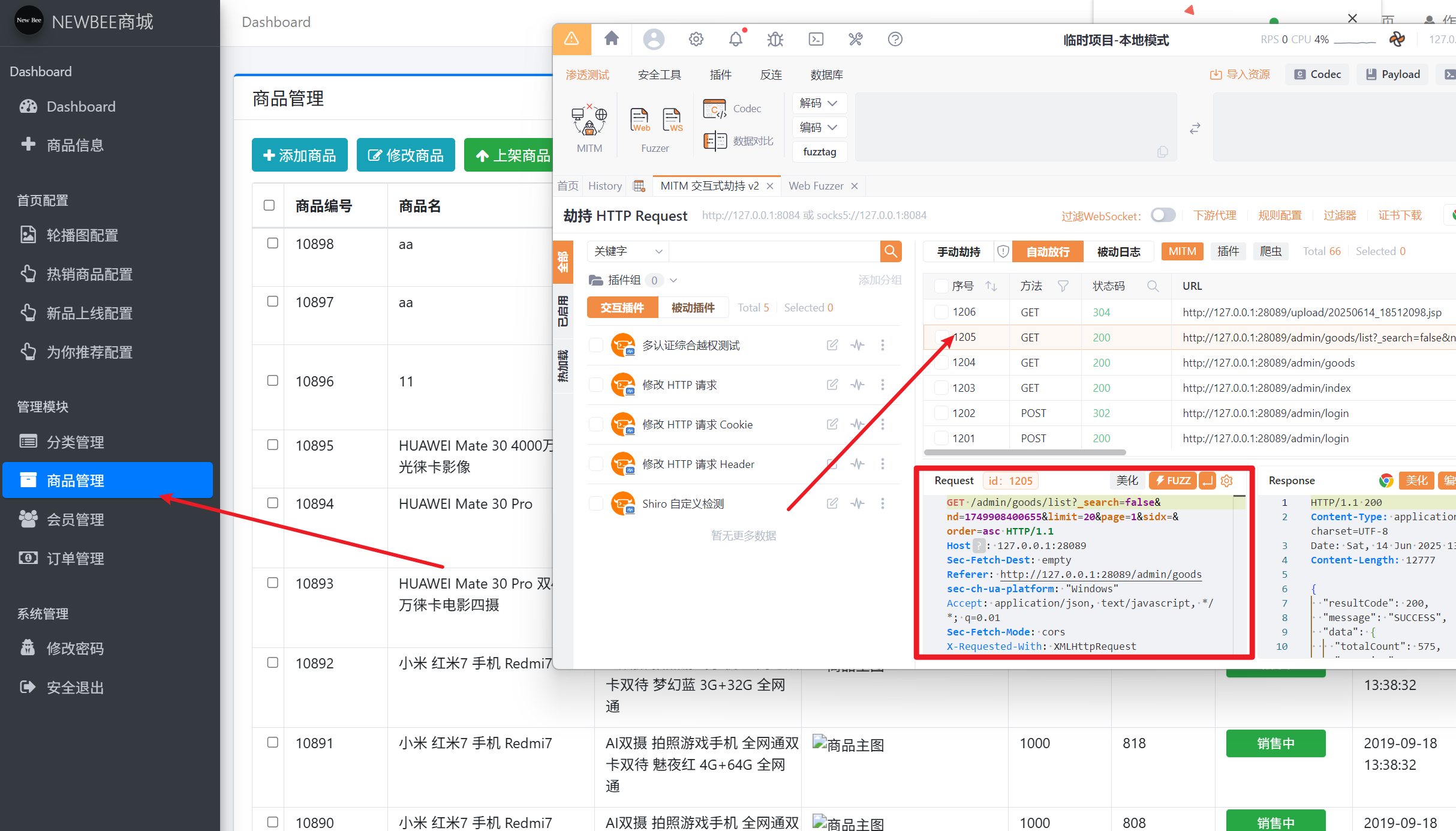 最后,整理代码信息可以的到接口路径为 /goods/list ,请求为 GET 方法,是个列表功能,根据代码路径来看应该是后台功能,这么看来我们找到了漏洞前端功能点。