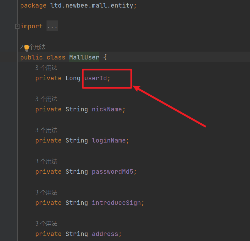 跟进 MallUser 查看,主要定义了以下内容,其中有个 userId