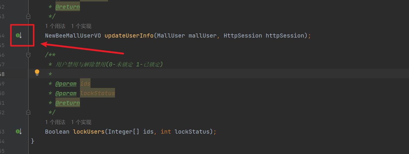 击左侧按钮,进行跟进到 NewBeeMallUserServiceImpl 层,updateUserInfo 方法具体代码如下: