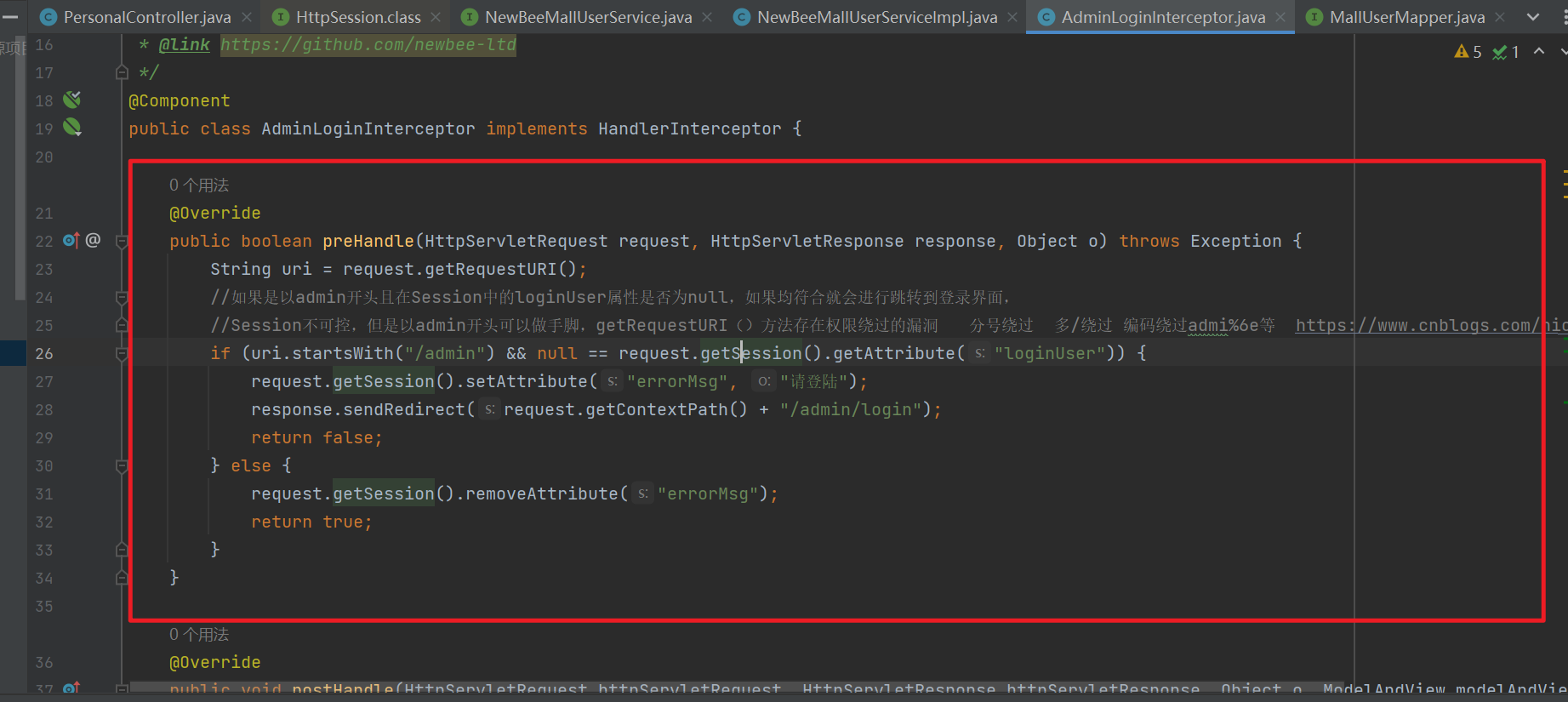 洞代码位于: src/main/java/ltd/newbee/mall/interceptor/AdminLoginInterceptor.java