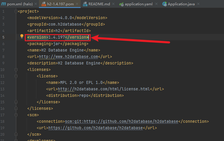curl + 左键 点击h2 进入pom文件,版本号为1.4.197 版本存在 CVE-2021-42392 漏洞(远程代码执行漏洞/JNDI 注入漏洞)