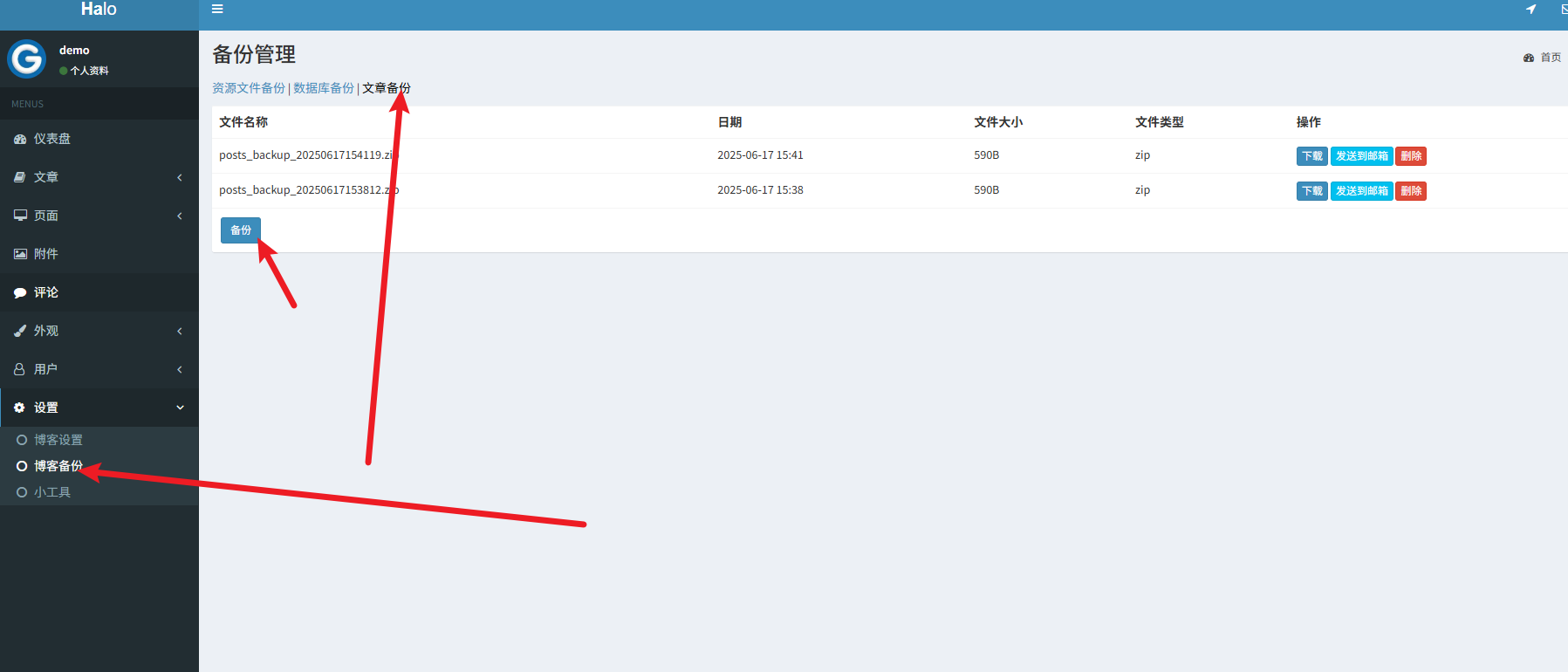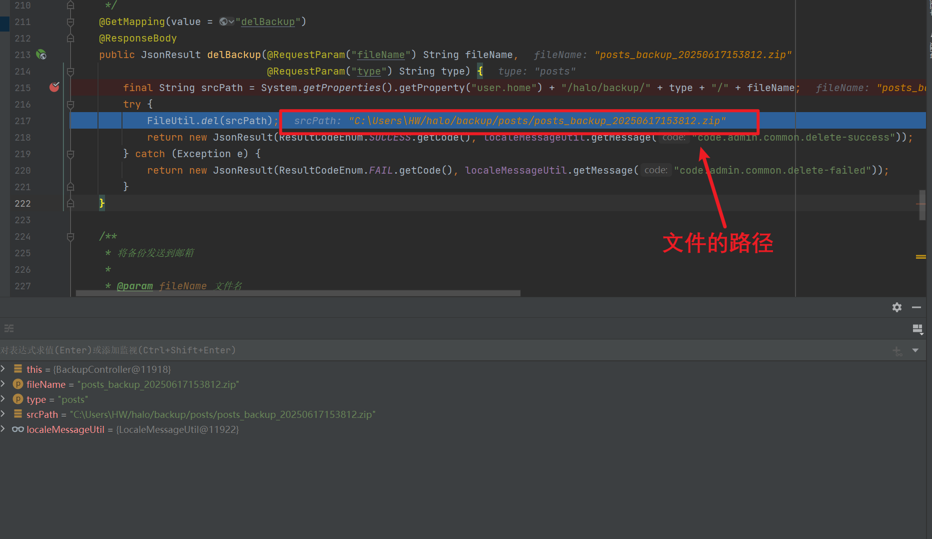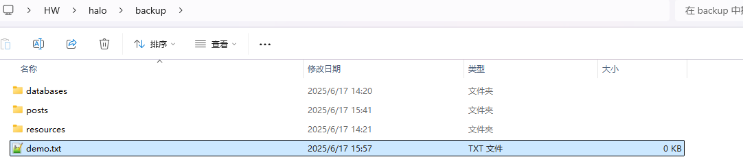 通过上面的分析可以看见路径是C:\Users\HW/halo/backup/posts/posts_backup_20250617153812.zip,在C:\Users\HW/halo/backup/路径下添加一个文件,以便测试