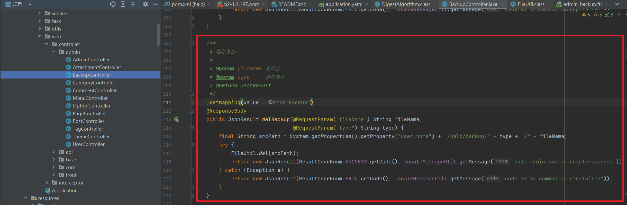 通过抓包获取到接口名为 /admin/backup/delBackup,通过关键字逐一尝试,最终使用关键字delBackup 定位到该接口的 Controller 层代码为 BackupController