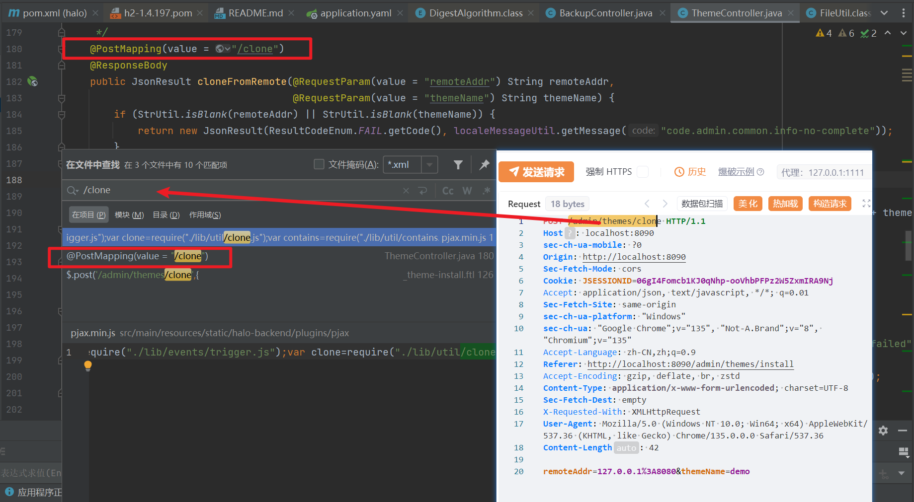通过抓包获取到接口名是 /admin/themes/clone ,关键字搜索/clone 定位到该接口的 Controller 层代码为 ThemeController