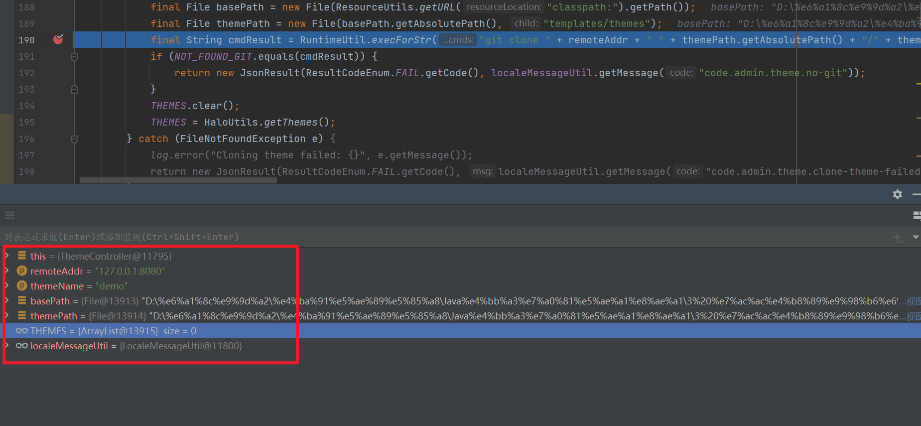 - 单击 remoteAddr 查看传递调用关系,在第 186 行处进行了 isBlank 判空操作,没什么其他值得注意的。然后就直接到第 190 行,进行了 git clone 拼接传入的 remoteAddr 参数操作,使用的是 RuntimeUtil.execForStr 方法执行命令