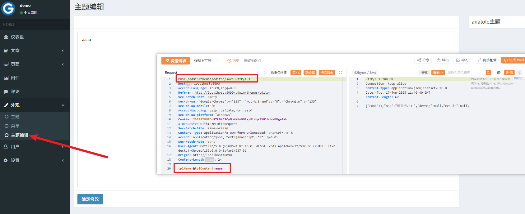 正向梳理功能时发现系统内存在一处主题编辑功能,通过文件名进行内容写入,可能存在任意文件写入漏洞