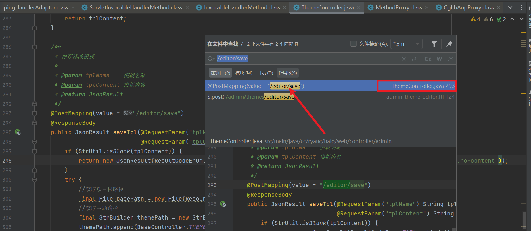 过抓包获取到接口名为 /admin/themes/editor/save ,通过关键字逐一尝试,最终使用关键字 /editor/save 定位到该接口的 Controller 层代码为 ThemeController
