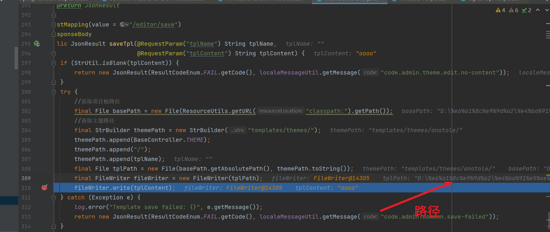 - 分析最后两行,这就很简单了,就是创建一个 FileWriter 对象,用于将内容写入到模板文件中,其中 tplPath 就是上面分析的路径,tplContent 就是从前端传来的参数,也就是写入的内容。其中要注意的是,使用 FileWriter 对象写入内容,如果指定的文件路径不存在的话, FileWriter 会自动创建一个新的文件
